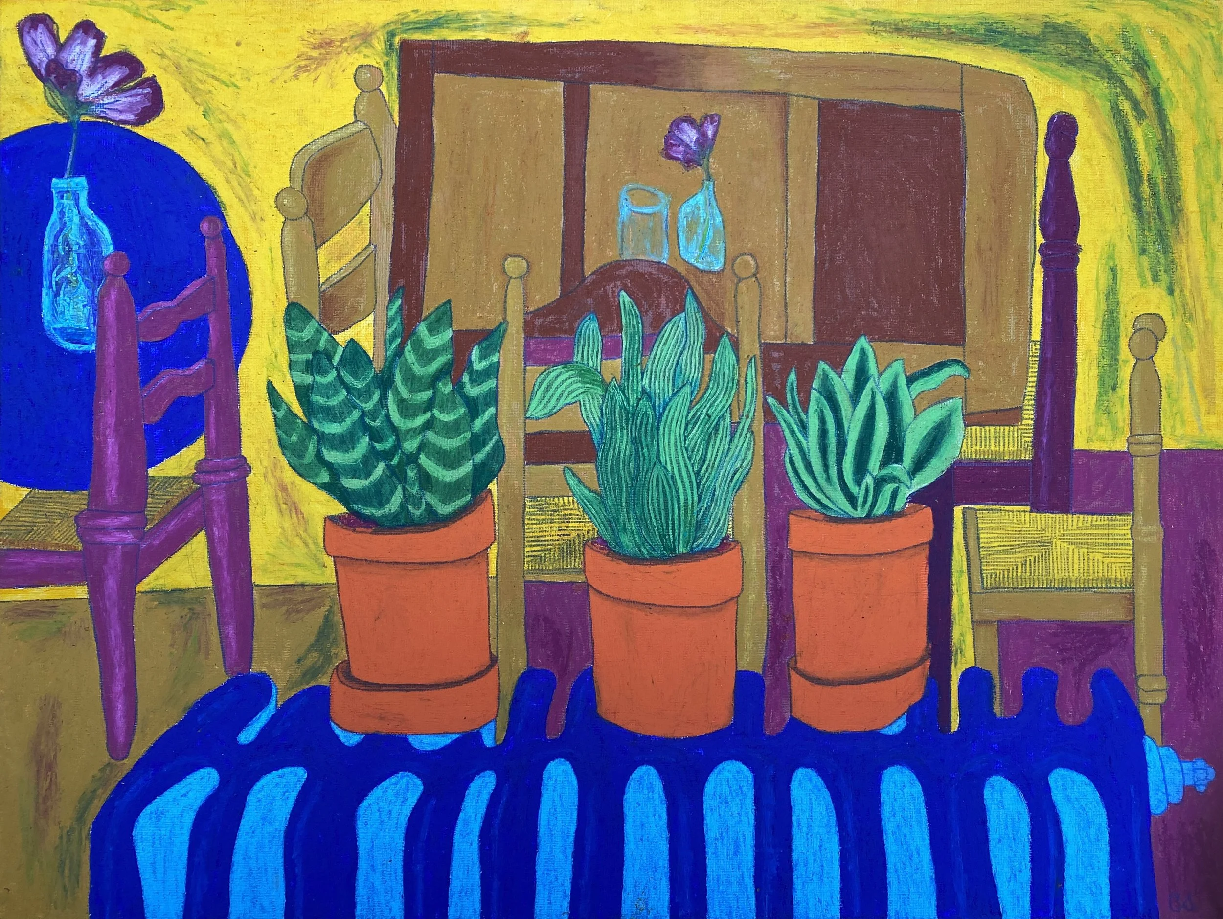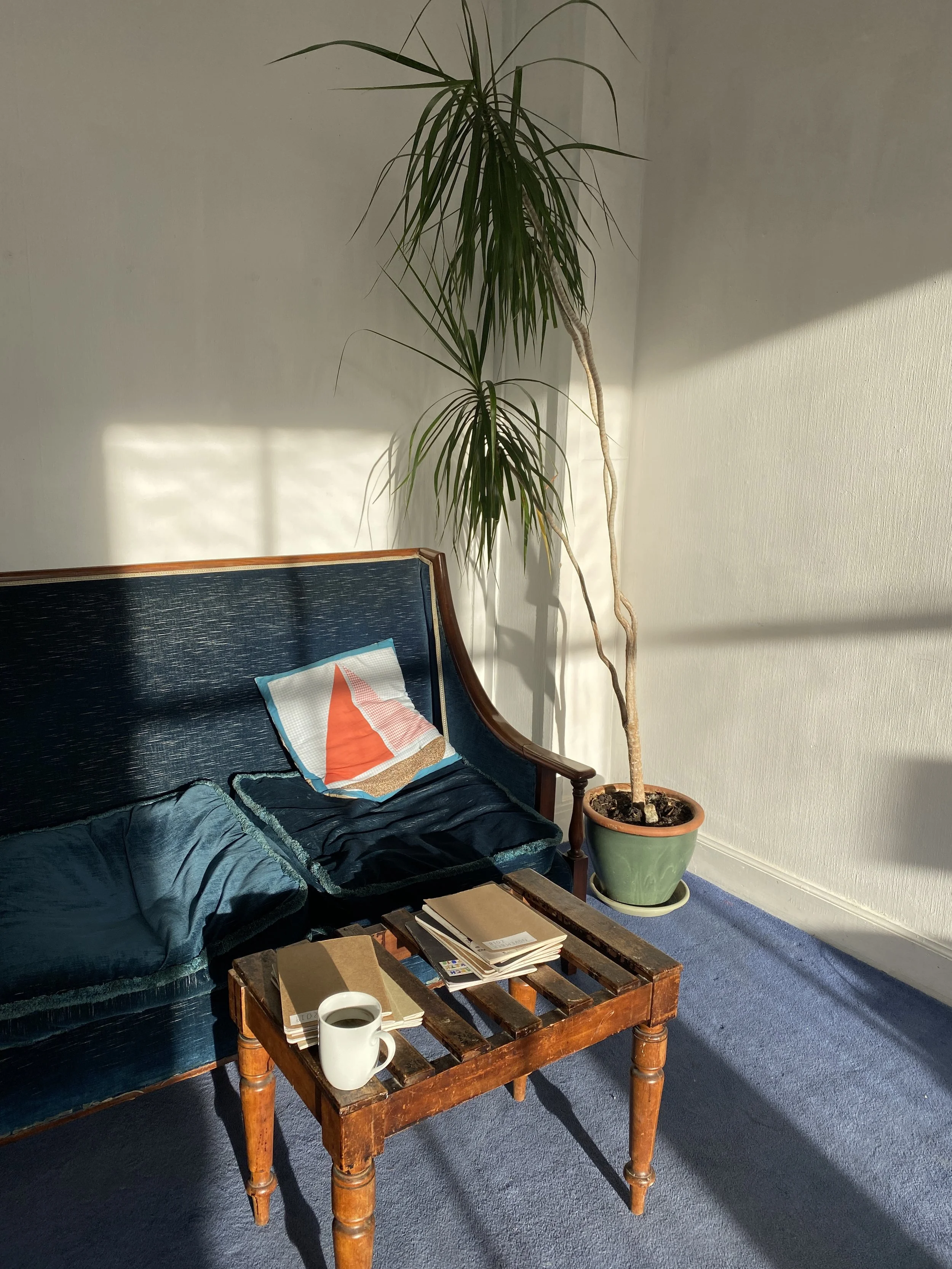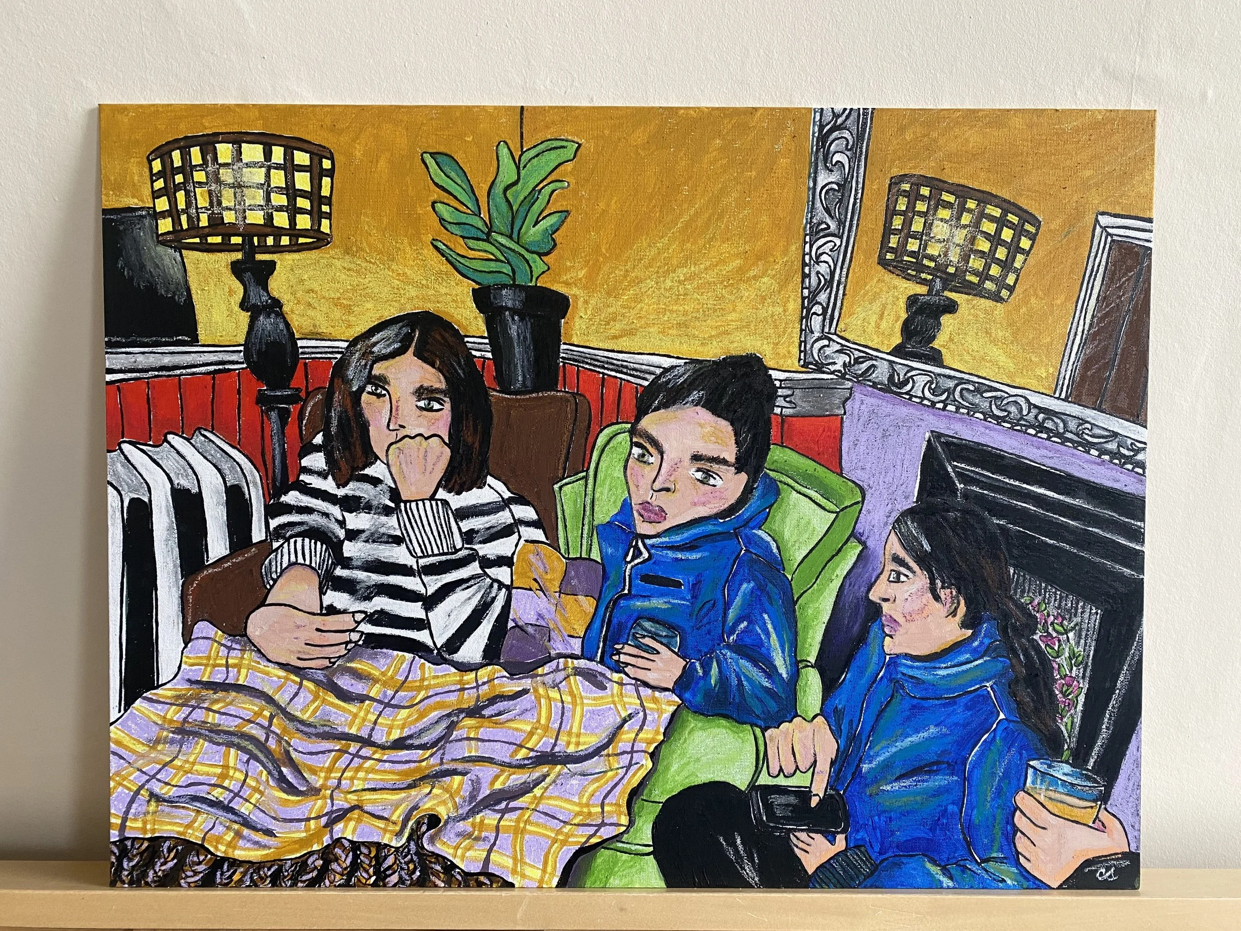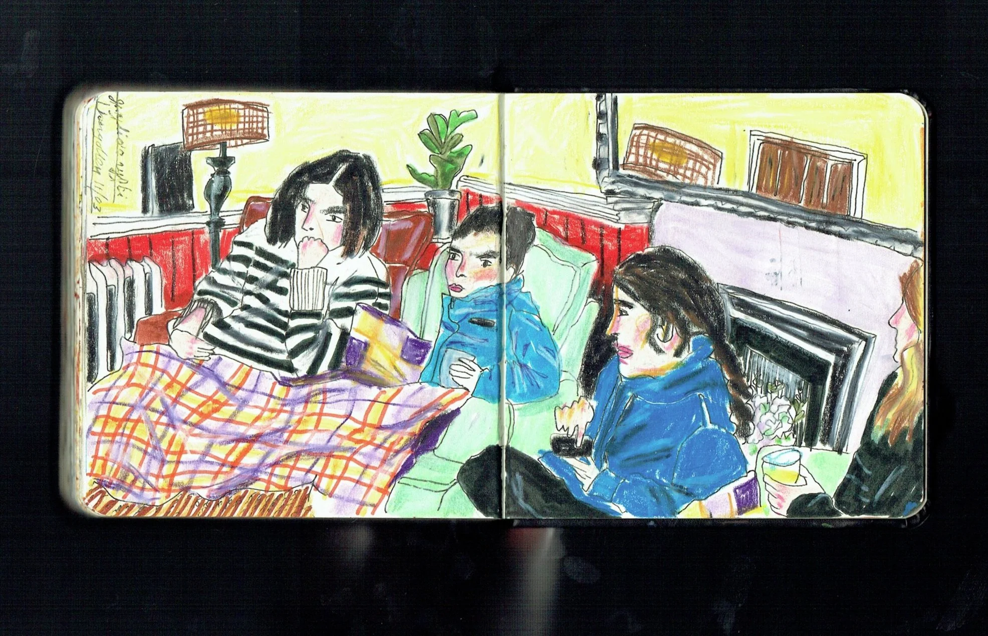 My intention was to curate a space that felt comforting and inviting as opposed to a conventional gallery space. This emulated the comforting presence of art in my life, scenes of cosy gatherings and joyful interiors in my paintings, and the community spirit of Granton Hub, the organisation that so kindly offered me this opportunity. Visitors were invited to wander the room with a cup of tea or take seat on a sunlit sofa, to flick through five years worth of sketchbook drawings.