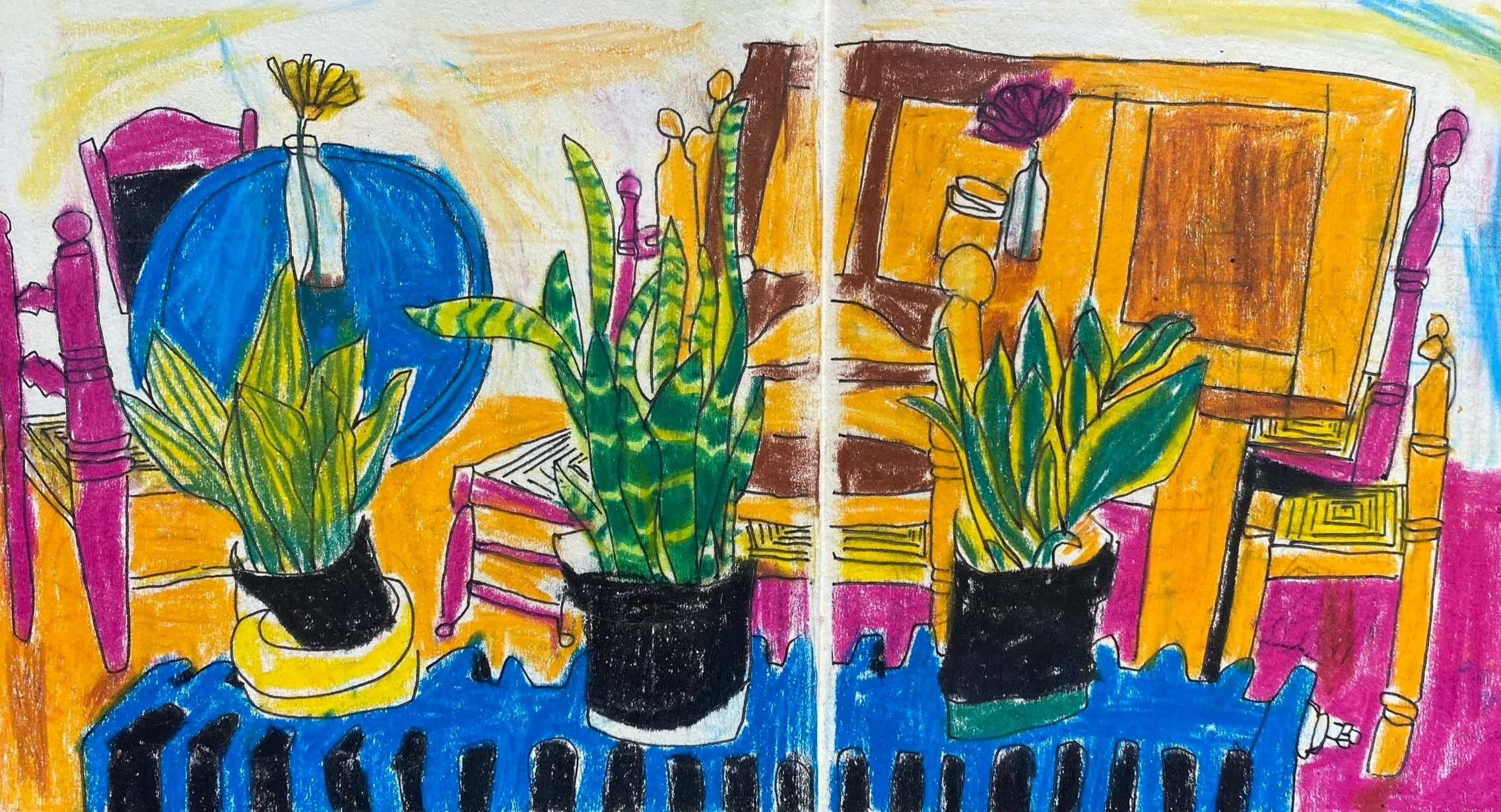 These sketchbooks act as a comfort blanket and allow me to feel like myself and at ease in many a situation. Documented through lively mark-making and bold colour choices, seemingly unremarkable moments become significant in their own way.